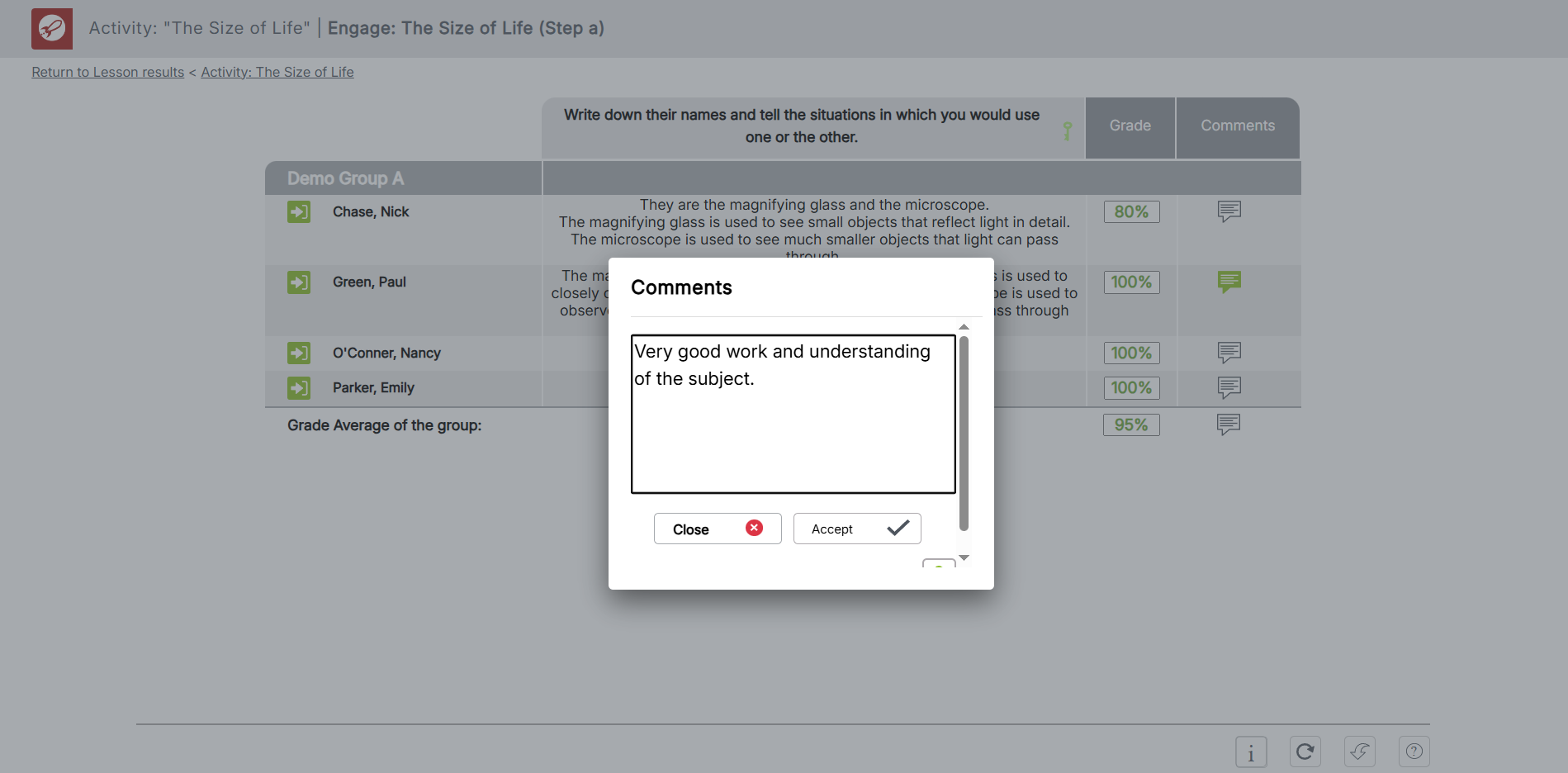 Teachers can now add group-level comments directly from the results table of any activity. Just like manual grading of open-ended questions, you can write one comment for the entire group and then personalize it for individual students as needed.
